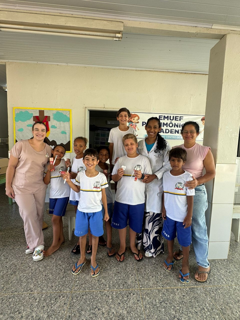 Como forma de incentivar hábitos saudáveis desde a infância, foram entregues kits de escovação para os estudantes, contribuindo para a promoção da saúde bucal.