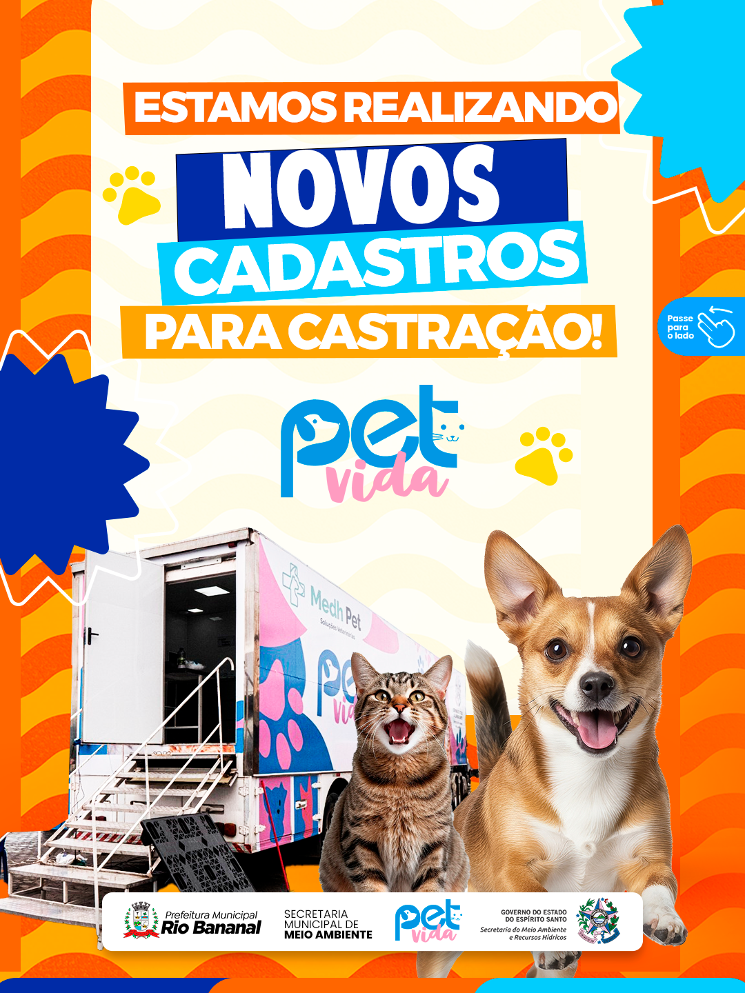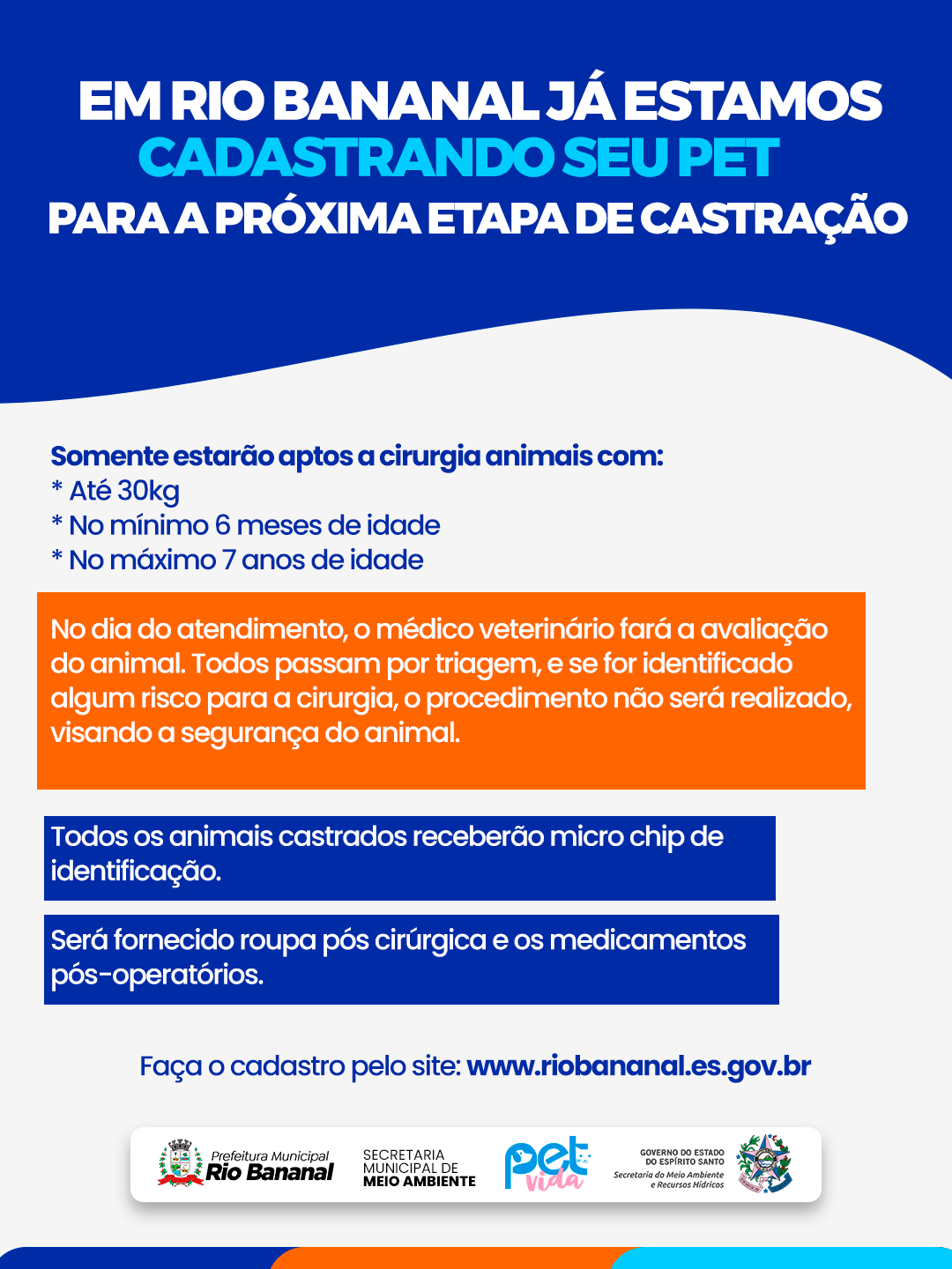 A Prefeitura de Rio Bananal, por meio da Secretaria Municipal de Meio Ambiente, em parceria com o programa Pet Vida e o Governo do Estado do Espírito Santo, está realizando novos cadastros para a próxima etapa do programa de castração animal no município.
