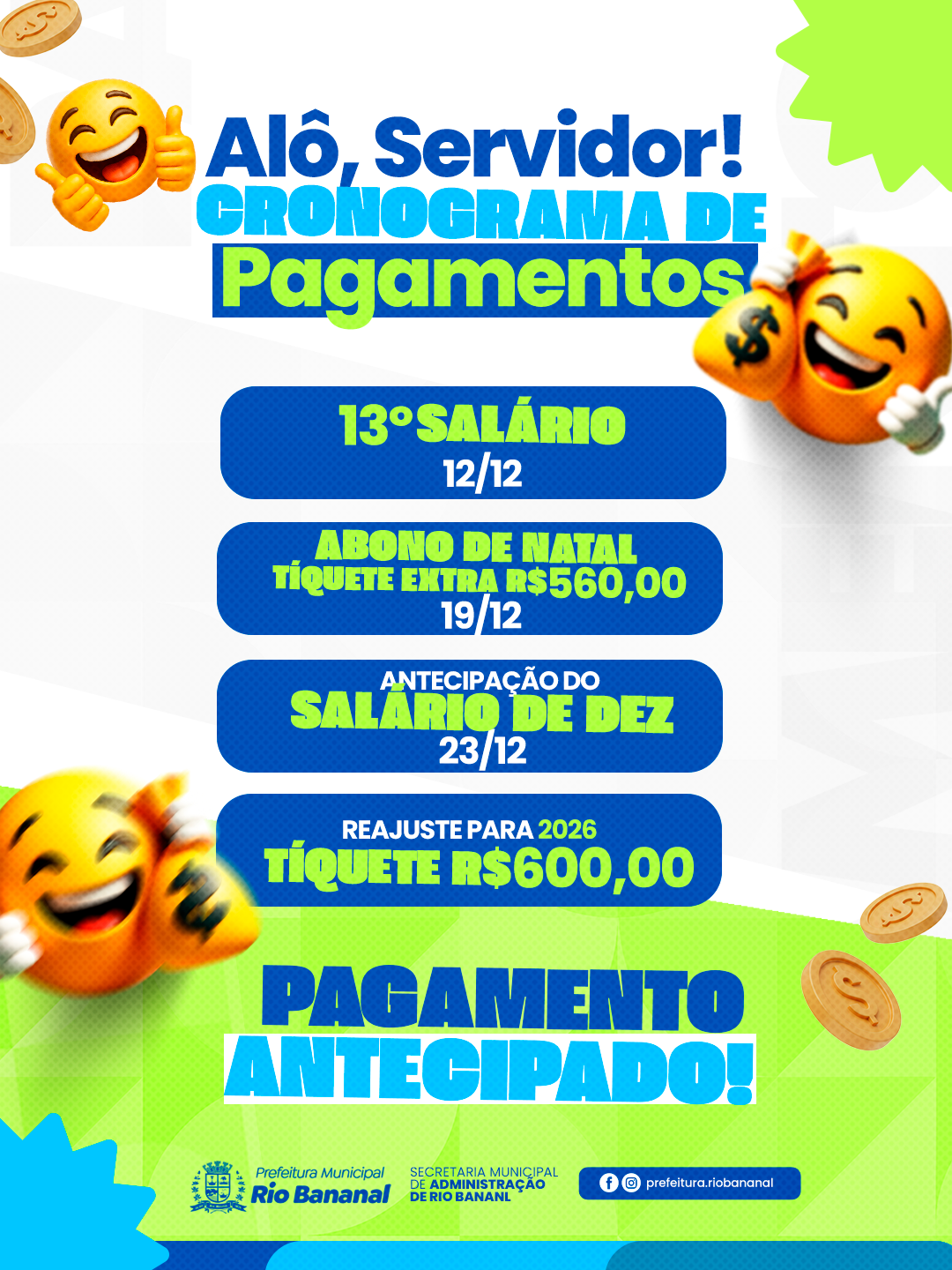 A Administração Municipal de Rio Bananal divulgou o cronograma oficial de pagamentos de fim de ano para os servidores públicos, reforçando o compromisso contínuo de valorização do funcionalismo e de responsabilidade na gestão dos recursos públicos.