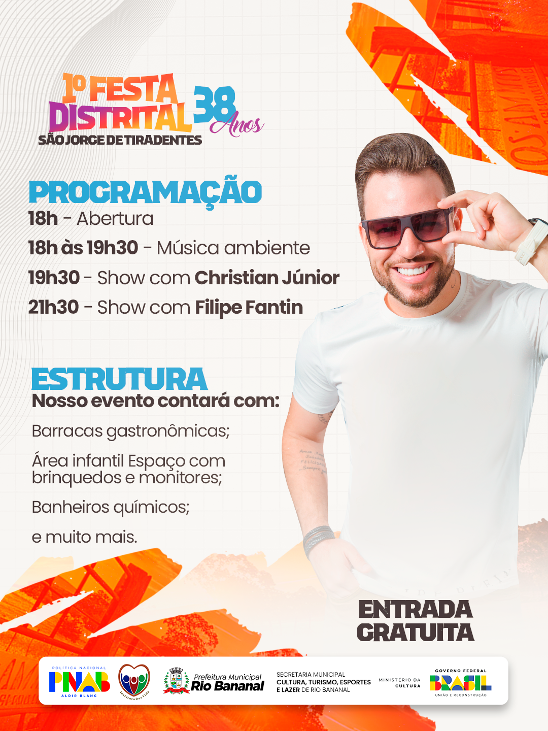 A programação começa a partir das 18h, com música ambiente, seguida de dois grandes shows: Christian Júnior, às 19h30, e Filipe Fantin, às 21h30, prometendo animar o público até o fim da noite.